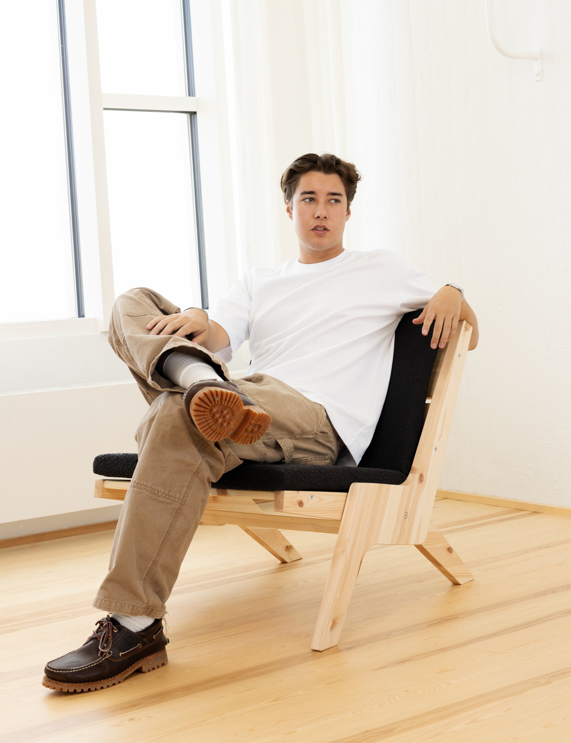 - Detaillierte Polsterung, die sich über die Rückenlehne erstreckt und an einer Rundstange endet