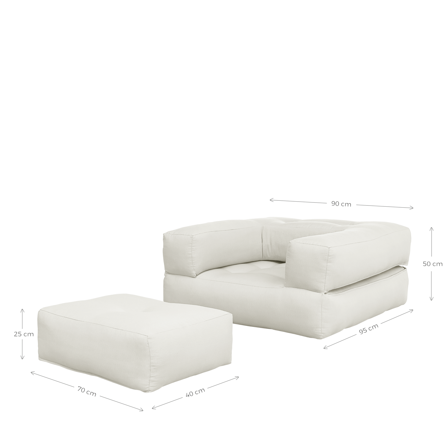Cube ist alles andere als eckig. Mit nur einem Umdrehen verwandelt sich Cube mühelos in drei verschiedene Formen: Einen niedrigen Sessel mit passendem Hocker, eine bequeme Matratze für Übernachtungsgäste oder einen hohen Pouf.