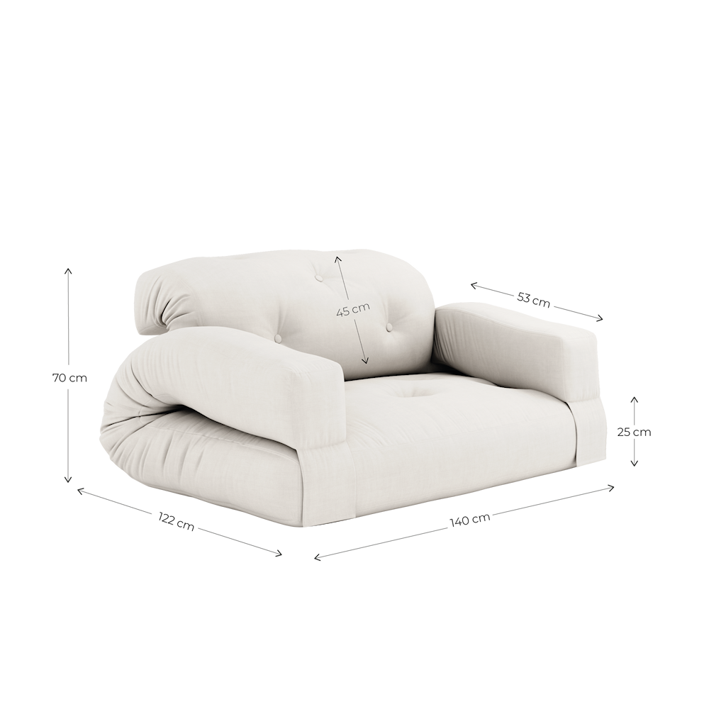 Hippo ist ein gemütliches Futon-Sofa, das sich leicht in eine Matratze verwandeln lässt. Wenn du die Rückenlehne löst und die Armlehnen hochklappst, legt sich Hippo flach aus und wird zu einer dicken, komfortablen Matratze – perfekt für Gäste und Übernachtungen.