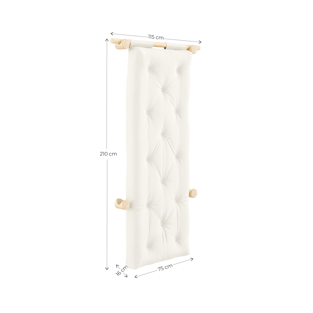 Die vier wandmontierten Halterungen halten Hooked sicher an seinem Platz und machen ihn zugleich zu einem dekorativen Element im Raum, wenn er verstaut ist. Wenn du einen Sitz brauchst, versetze ihn einfach in die untere Position für eine bequeme Lounge‑Anordnung. Bereit zum Schlafen? Klappe die Matratze auf den Boden aus – und in Sekunden hast du ein gemütliches Bett.