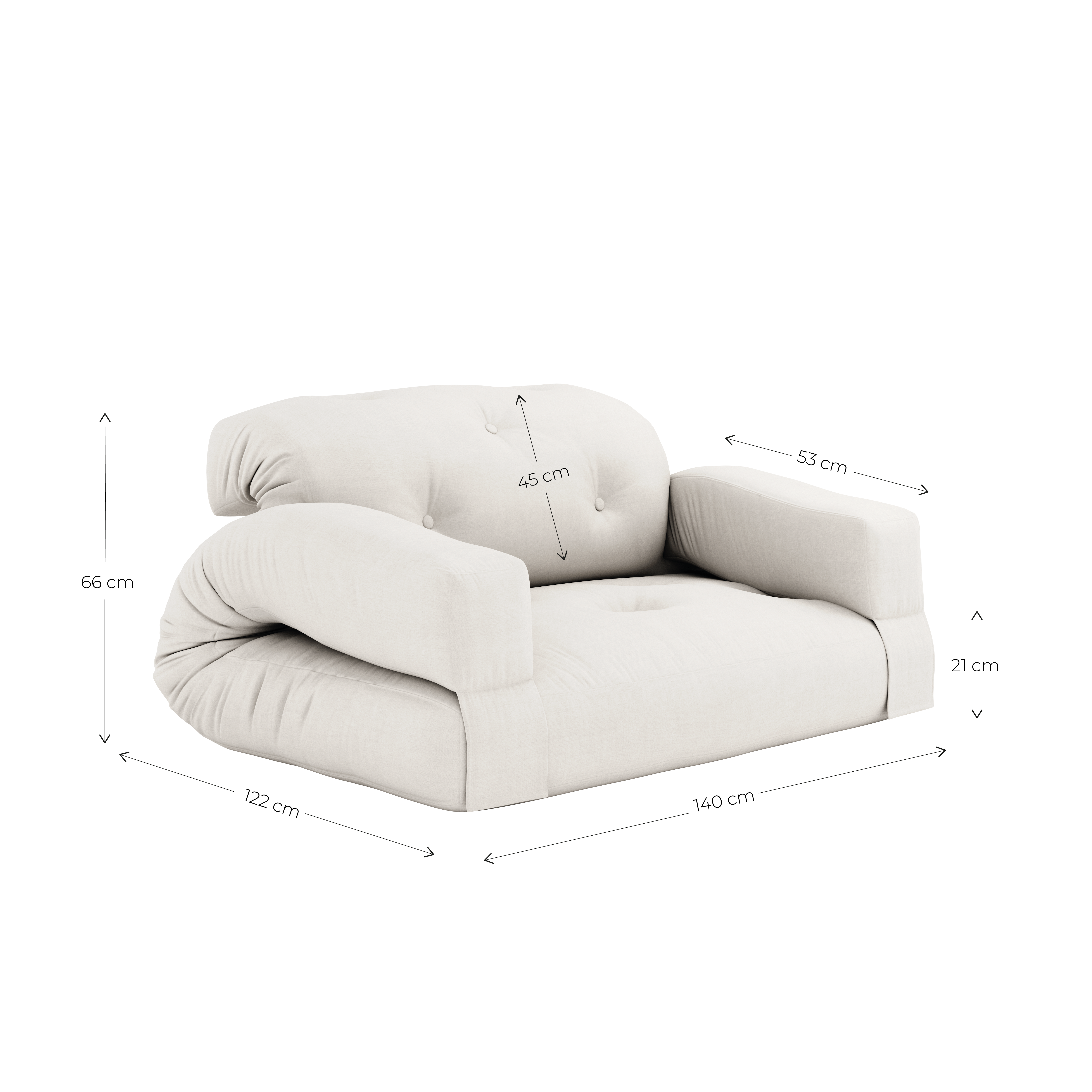 Hippo is a comfy futon sofa that can easily be converted into a mattress. By releasing the back of the sofa and lifting up the arms, Hippo lays out flat, becoming a thick, rich mattress that's perfect for guests and sleep-overs.