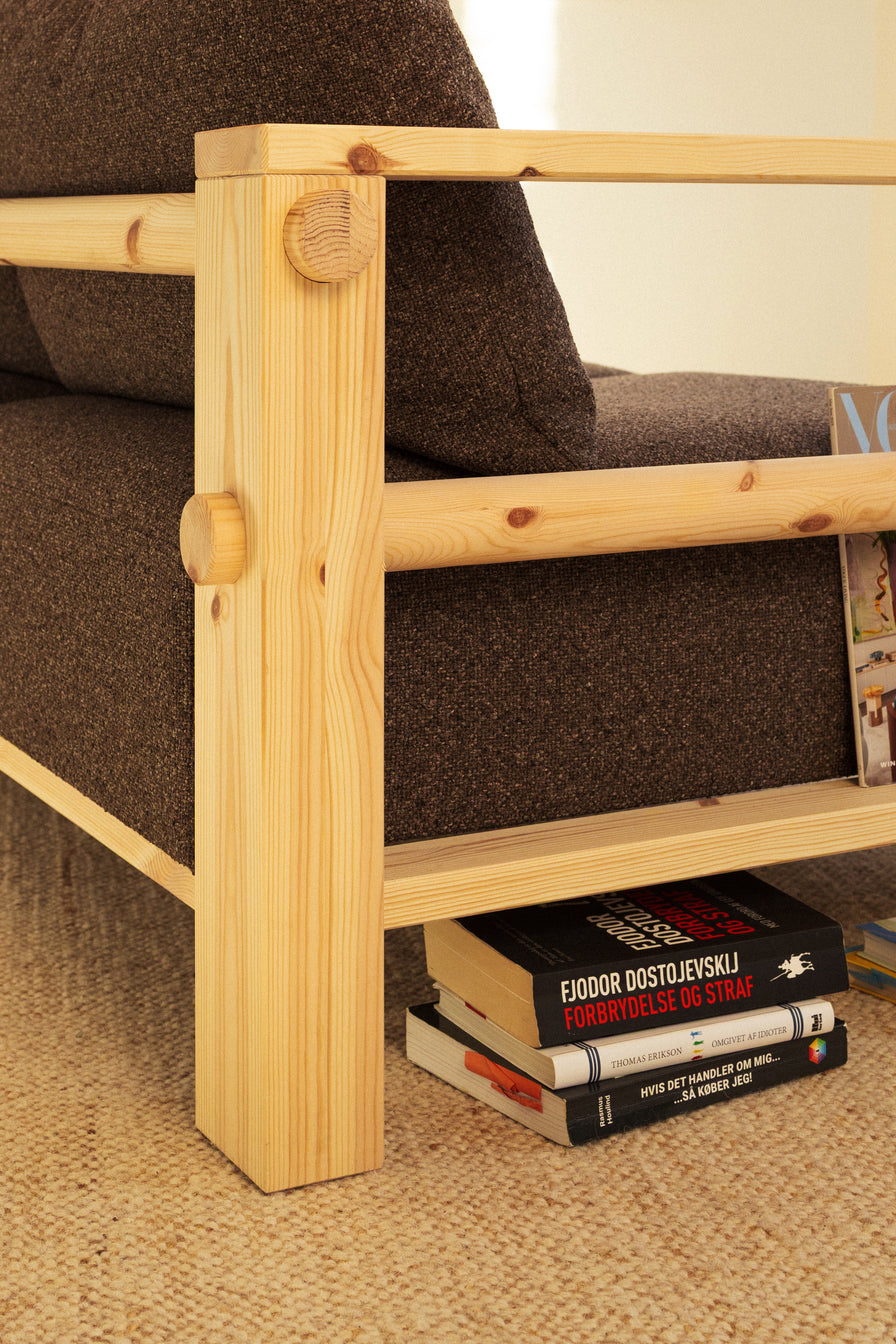 Upholstered in a textured textile that adds depth and tactility, while the solid pine frame keeps the expression clear and grounded.