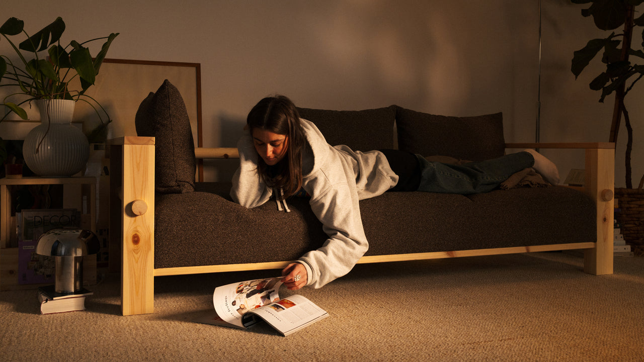 A sofa that holds its shape by day and gives it up when the night begins.