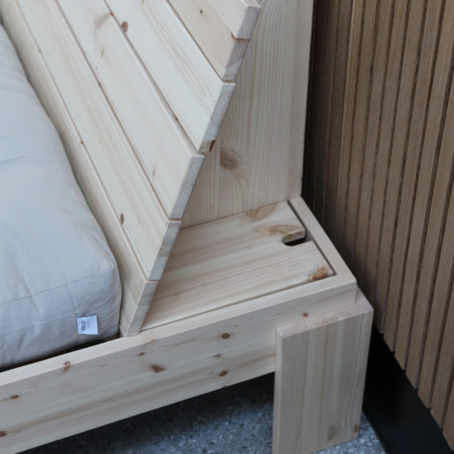Med Layers bed med opbevarings-sengegavl er det let at holde soveværelset ryddeligt. Gavlen kan hurtigt og nemt åbnes og afslører et stort, skjult opbevaringsrum – perfekt til opbevaring af tæpper, puder eller sengetøj. Derudover er der to små, diskrete rum i siderne af gavlen, som giver plads til mobil, oplader eller andre småting, du vil have tæt på. Et smart kabeludtræk gør det muligt at oplade dine enheder uden rod fra synlige ledninger.