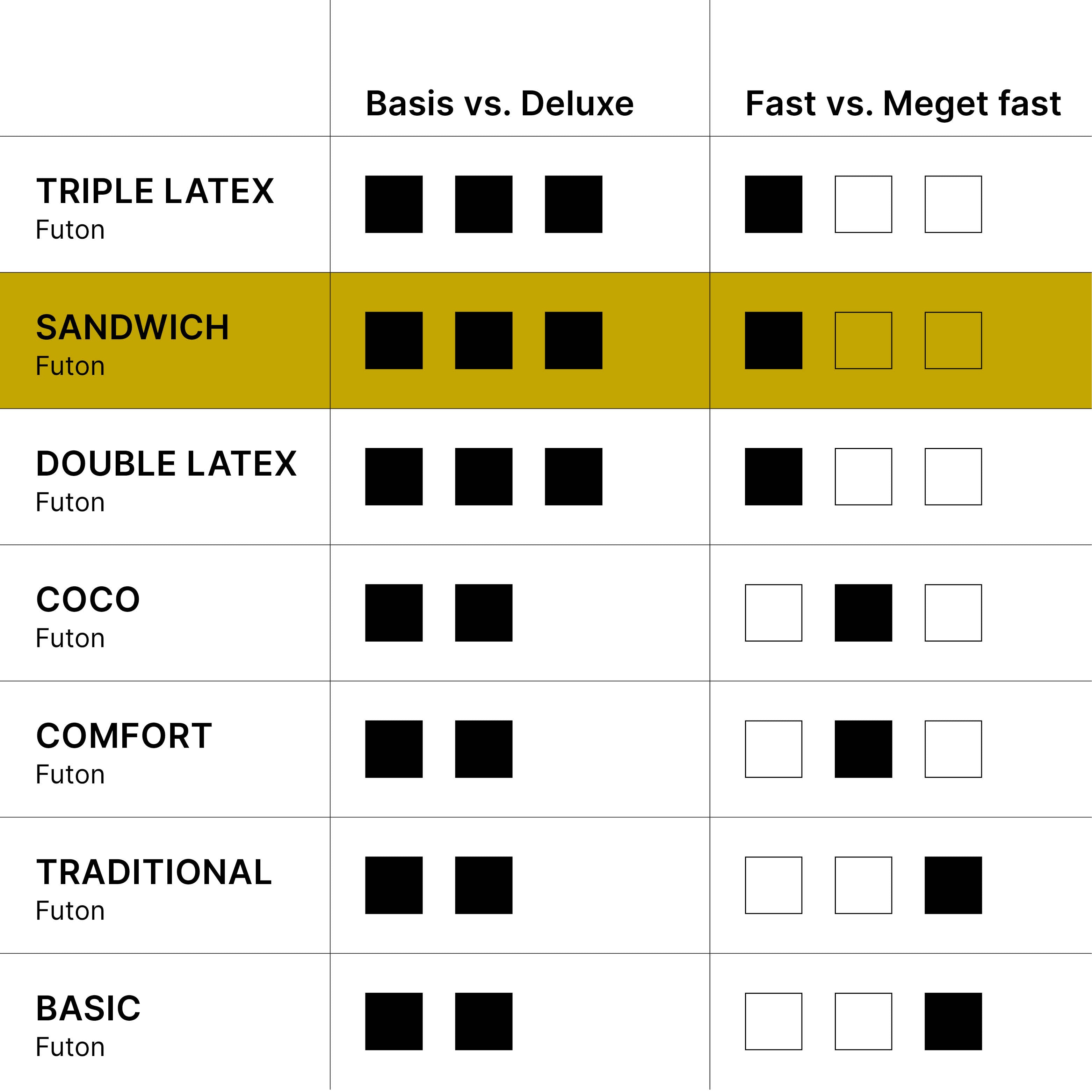 Unser Sandwich-Futon ist eine 16 cm dicke Baumwollmatratze mit einem Kern aus Latexschaum und einer Kokosfaserplatte. Indem wir 5-10% Polyester zur Baumwolle hinzufügen, stellen wir für unsere Futons eine höhere Dichte und größere Dicke im Vergleich zu traditionellen japanischen Futonbetten sicher. Sie behalten jedoch immer noch all die guten Eigenschaften eines traditionellen japanischen Futons bei. Der Sandwich-Futon bietet Ihnen einen mittelweichen Schlafkomfort. Die Baumwolle im Futon passt sich Ihrem Körper an, die Kokosplatte stützt ihn und der weiche Latexschaum im Kern dämpft leichte Bewegungen. Bitte beachte, dass alle unsere Futonprodukte handgefertigt sind, so dass es zu leichten Abweichungen bei den Abmessungen und dem Gewicht kommen kann.