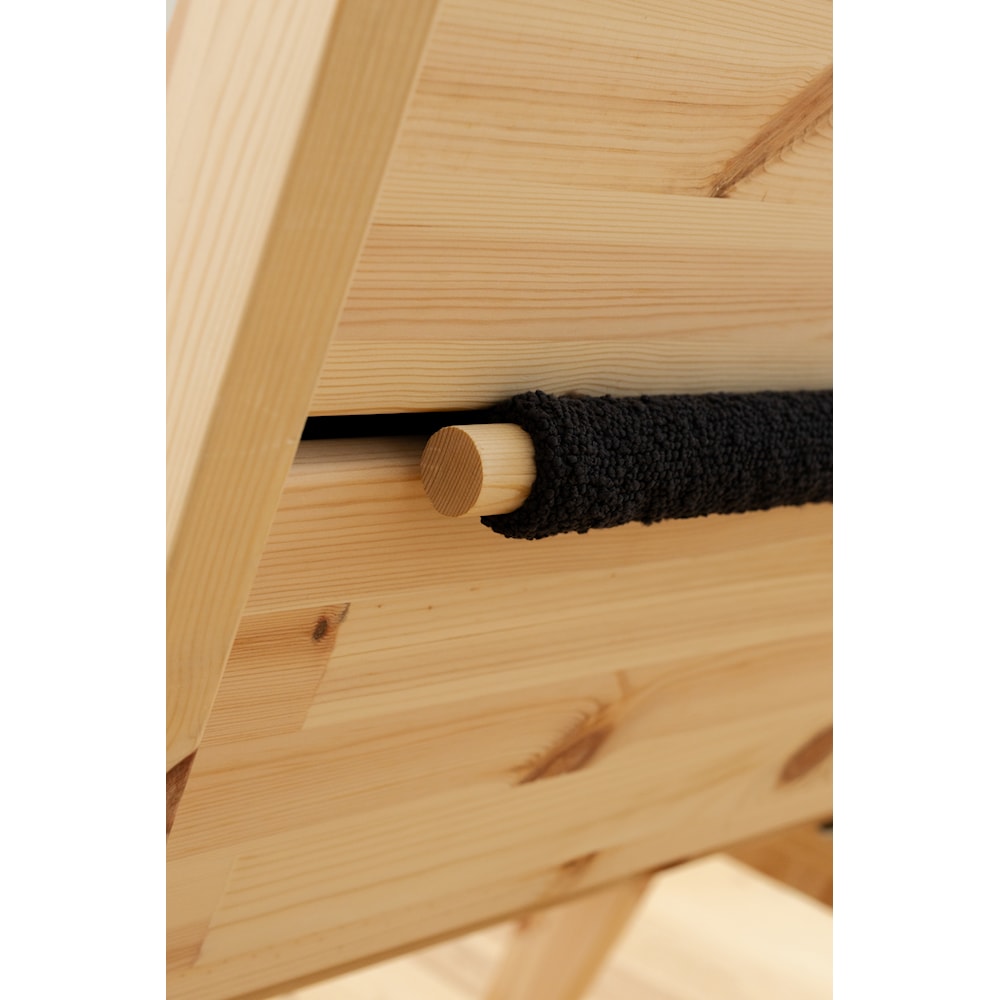 Det gennemgående betræk føres elegant gennem ryglænet og fæstnes med en rundstok, der sætter fokus på håndværk og detaljegrad og understreger stolens ærlige konstruktion. Det bløde bouclé-betræk tilfører madrassen karakter og varme – og kan nemt tages af og vaskes, så stolen altid fremstår indbydende.