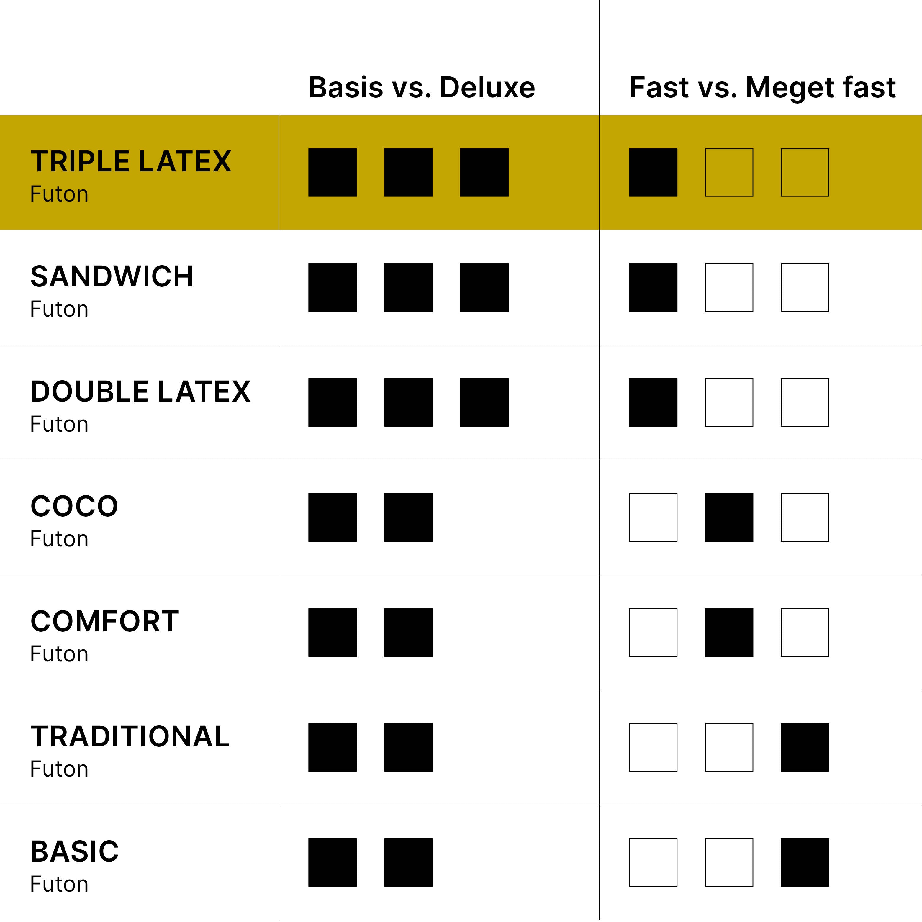 Unser Triple latex futon ist eine 20 cm dicke Matratze aus Baumwolle und Wolle mit einem Kern aus Latexschaum und Pferdehaar. Durch die Beimischung von 5–10% Polyester zum Baumwollanteil sorgen wir für eine höhere Dichte und Dicke unserer Futons im Vergleich zur traditionellen japanischen Futon-Bettware. Gleichzeitig behält er alle guten Eigenschaften eines traditionellen japanischen Futons bei. Der Triple latex futon bietet dir eine weiche Liegefläche. Die Baumwolle passt sich deinem Körper an und stützt ihn, die Wolle sorgt für ein gutes Raumklima, der Latex dämpft alle Bewegungen, während das Pferdehaar gegen Kälte isoliert und gleichzeitig Wärme und Feuchtigkeit ableitet.