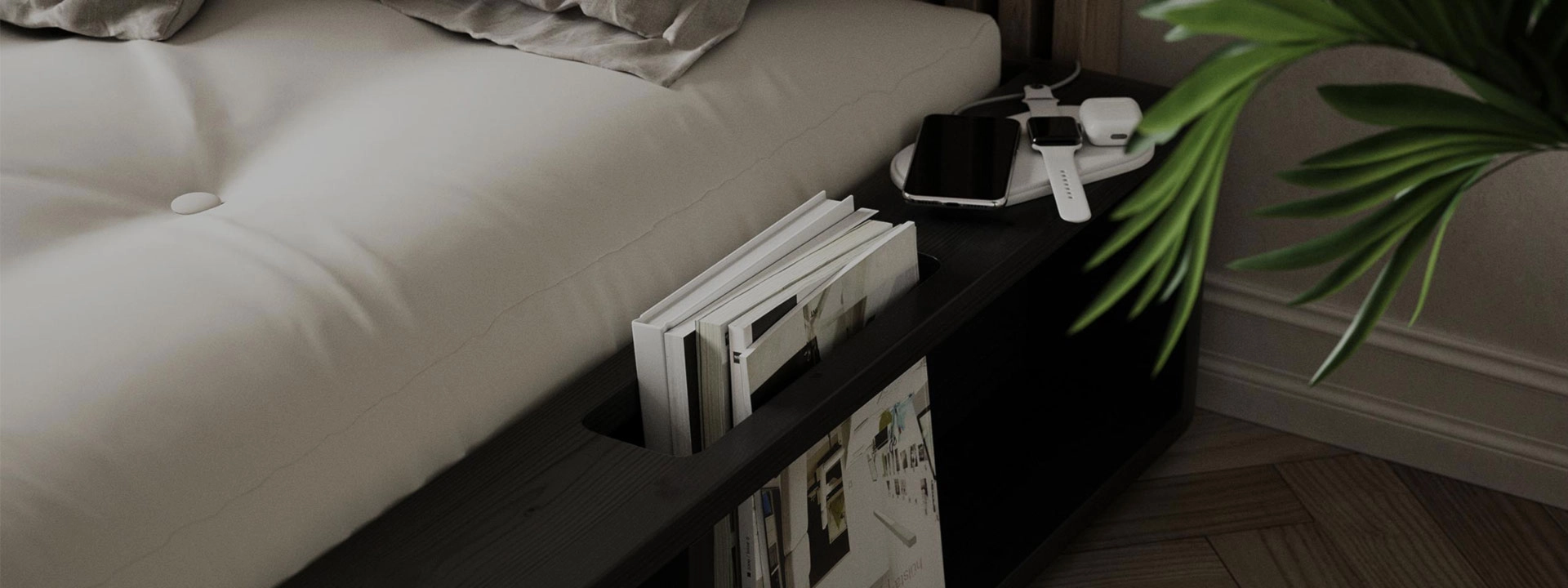 Ziggy is designed with great attention to materials and functionality. The functionality of Ziggy is built right into the frame, by a total of six open storage compartments, that allows for more storage space in smaller apartments or homes. To store your favorite bedtime stories, the frame has a smart side ‘pocket’ system. Lounge. Read. Store. Furthermore, the broad frame surface allows you to easily charge your smart devices right by your bedside, replacing the bedside table. A tatami mat can be added to create a Japanese look to your bedroom.