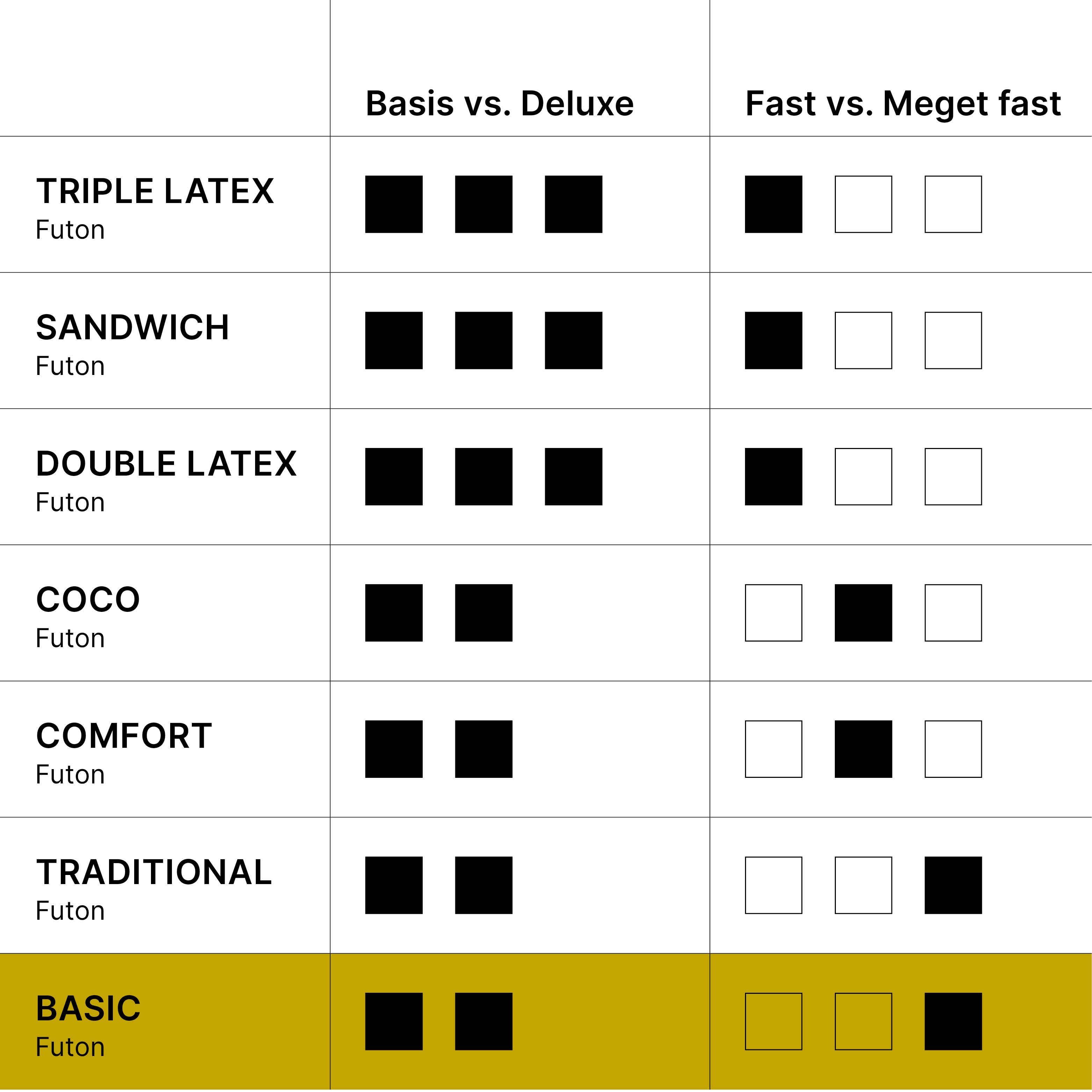 Our basic futon is an 11 cm thick cotton bed mattress with a PU foam core. By applying 5-10% polyester to our cotton, we ensure the higher density and thickness of our futons compared to traditional Japanese futon bedding. However, it still inherits all the good qualities of a traditional Japanese futon. The Basic futon will give you medium-firm sleeping comfort. The cotton in the futon will adjust itself to your body and support it, and the foam core will isolate slight movements.